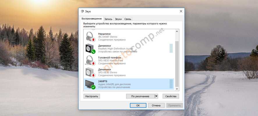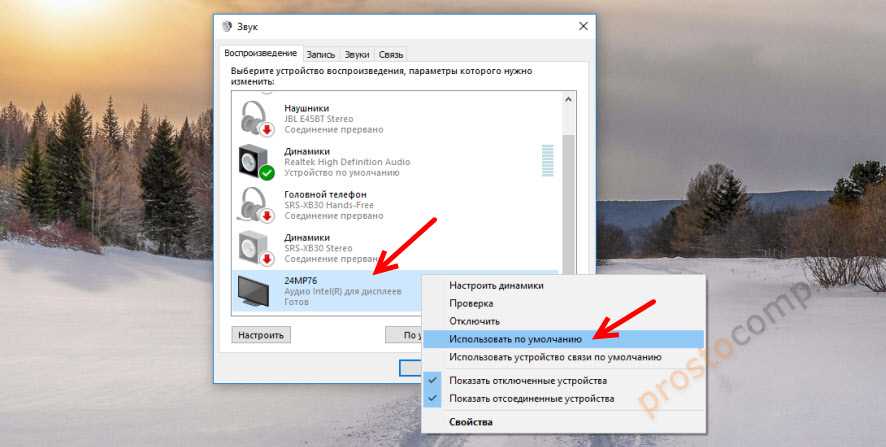 Если вы все сделали, но звук на телевизор не идет, то проверьте, не скручена ли громкость на самом телевизоре и не отключен ли на нем звук. Бывает, что телевизор не отображается в списке устройств для воспроизведения. В таком случае попробуйте установить галочки возле «Показать отключенные устройства» и «Показать отсоединенные устройства». Если ТВ после этого появится (со статусом «Отключено»), то нажмите на него и выберите «Включить». После чего сделайте его устройством по умолчанию.