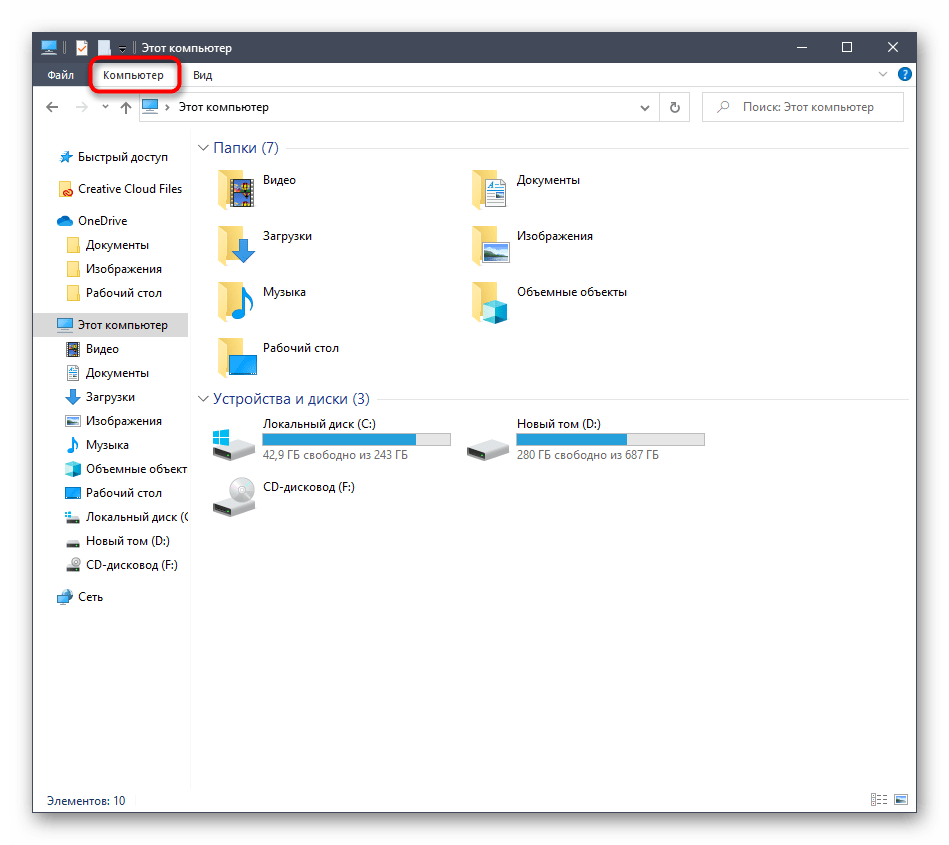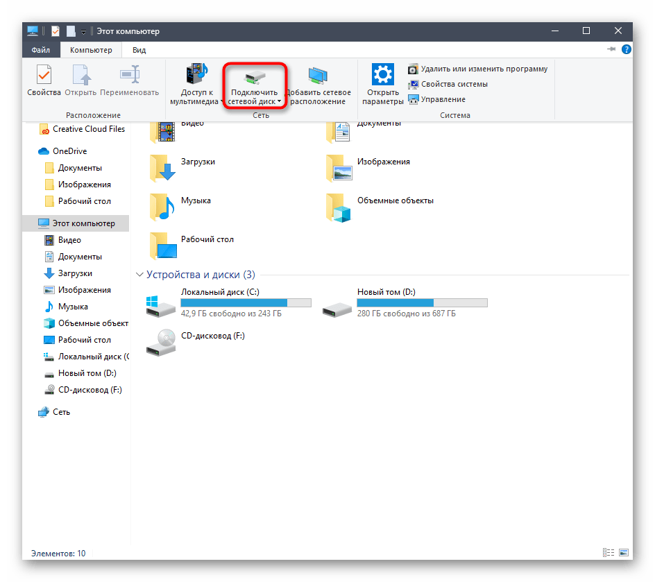Самый простой метод создания сетевого диска — использование меню «Этот компьютер». Там пользователю нужно только нажать на несколько кнопок, чтобы справиться с поставленной задачей. Давайте более детально рассмотрим этот вариант, разобрав каждый шаг.