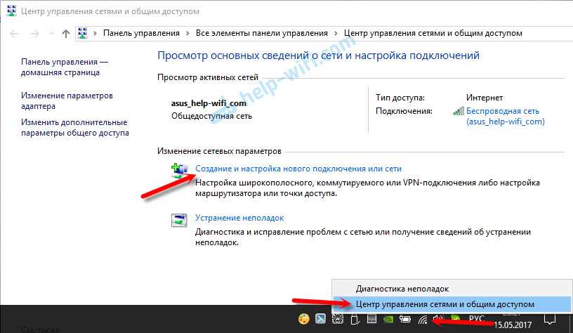 Зайдите в «Центр управления сетями и общим доступом» и нажмите на «Создание и настройка нового подключения или сети».