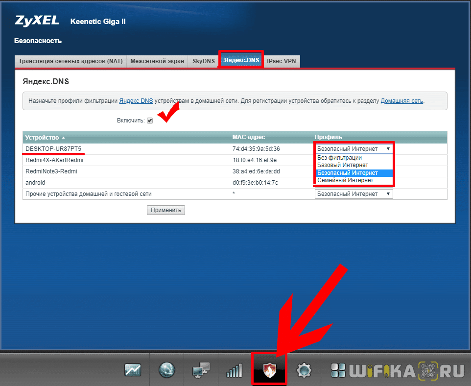 Здесь можно для каждого зарегистрированного в сети компьютера (о том, как их регистрировать, я писал в статье про блокировку сайтов — прочитайте) назначить свое правило фильтрации или задать одно единое для всех незарегистрированных устройств. Например, для того, за которым сидит ребенок, назначить семейный режим, а для собственного — базовый.