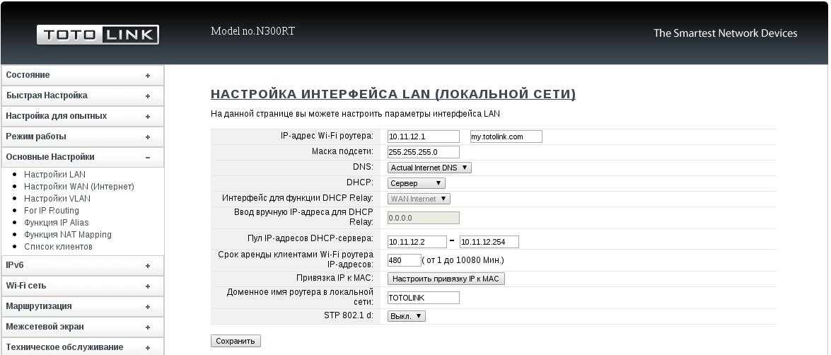 Перейдите в пункт меню «Основные настройки» → «Настройки LAN». Измените настройки по вашему желанию. Адреса в полях «IP-адрес Wi-Fi роутера», «Маска подсети», «Пул IP-адресов DHCP-сервера» должны быть подобраны соответственно. Например если Вы хотите организовать сеть 10.11.12.0/24 (254 адреса), то настройки будут такими.