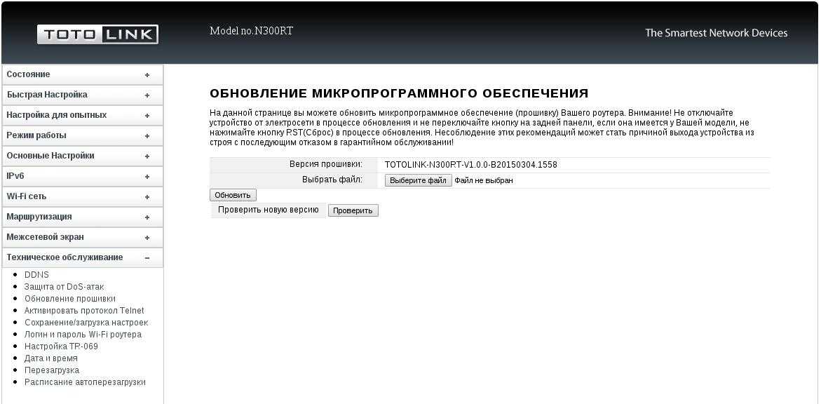 Перейдите в пункт меню «Техническое обслуживание» → «Обновление прошивки» Щёлкните по кнопке «Выберите файл» и укажите путь к файлу прошивки. Нажмите кнопку «Открыть» в диалоговом окне выбора файла для загрузки, затем «Обновить» в меню роутера. Дождитесь обновления прошивки. Вы можете проверить наличие обновлённой прошивки на сайте Алмател при помощи кнопки «Проверить»