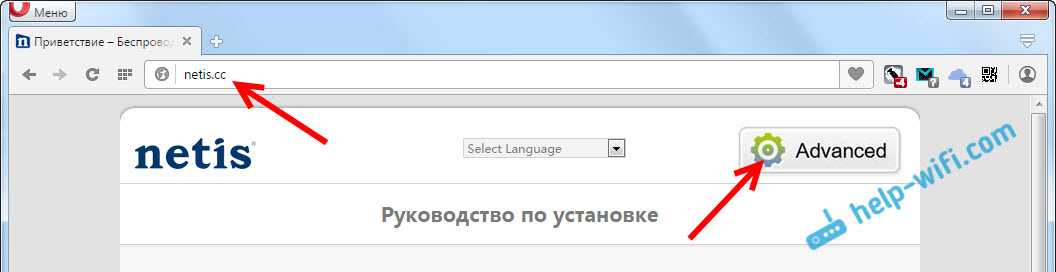 Для смены пароля нужно подключится к роутеру по Wi-Fi сети, или по кабелю. Дальше заходим в настройки роутера Netis. Открываем браузер, и переходим по адресу http://netis.cc, или 192.168.1.1. Если вы уже установили пароль на доступ к настройкам, то нужно будет указать его. Откроется страница с быстрыми настройками. Нажмите на кнопку Advanced, что бы перейти к расширенным настройкам.