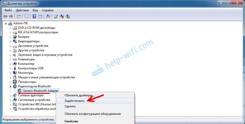 Включить Bluetooth можно и программно, как было описано в предыдущем разделе статьи, или через «Диспетчер устройств», командой контекстного меню «Задействовать». Запуск радиомодуля на разных версиях Windows имеет некоторые отличия.