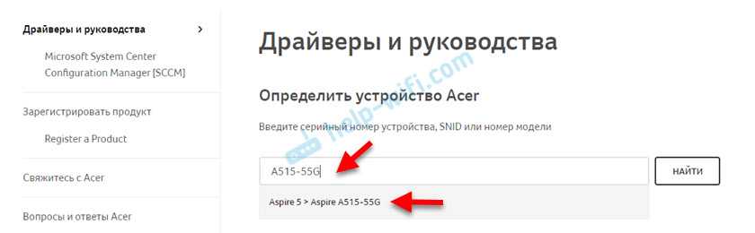 Вернемся к нашему примеру. Так как ноутбук у нас Acer Aspire 5 A515-55G, то заходим на сайт Acer. Находим там раздел с загрузками.
