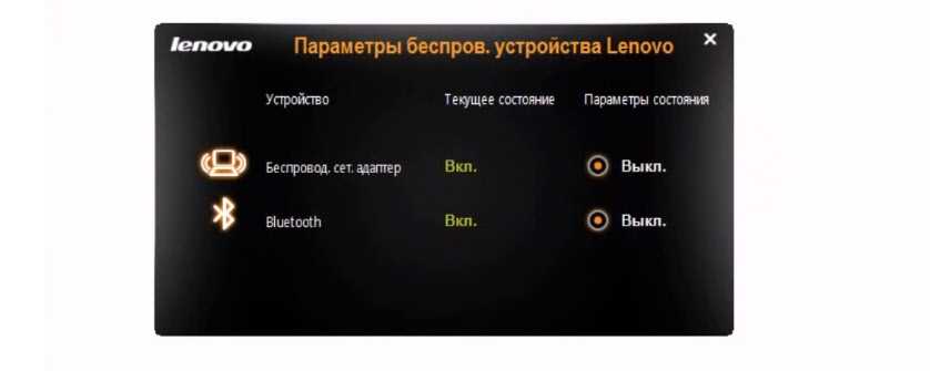 Бывает, что на ноутбуке установлена специальная утилита для управления беспроводными сетями, или электропитанием. Это фирменные утилиты, которые разработаны производителями ноутбуков. Так вот, Bluetooth может быть отключен в этой утилите, и вы его нигде не сможете найти в системе. Примерно так выглядит эта утилита на ноутбуках Lenovo: