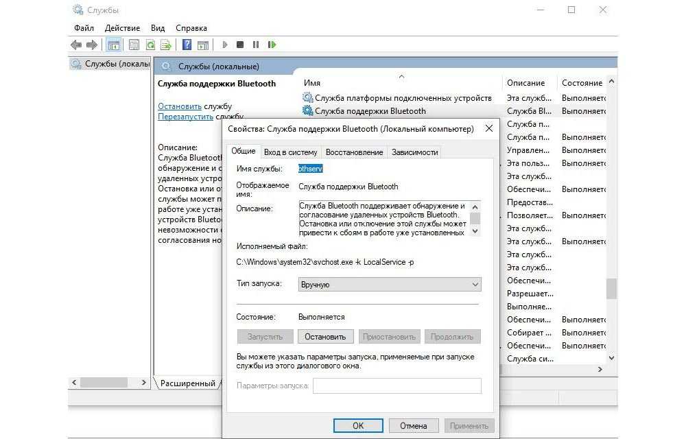 В появившемся окне консоли потребуется отыскать строчку «Служба поддержки Bluetooth», выделить и применить команду «Запустить». Чтобы служба всегда стартовала при загрузке операционной системы и продолжала поддерживать соединение в списке «Тип запуска», выставляется параметр «Автоматически»