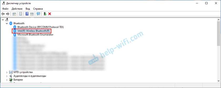 В диспетчере устройств нас интересует вкладка «Bluetooth». В Windows 7 она называется «Радиомодули Bluetooth». Если такая вкладка есть, значит данный модуль установлен и должен работать. Откройте эту вкладку и посмотрите, есть ли там сам адаптер. Выглядит он примерно вот так (в Windows 10) :