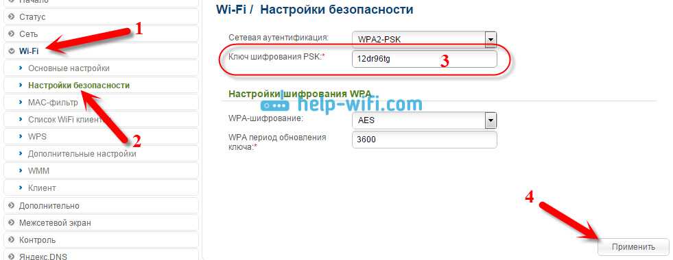 В настройках переходим на вкладку Wi-Fi/Настройки безопасности и в поле Ключ шифрования PSK указываем новый пароль к вашей Wi-Fi сети. Пароль должен быть указан английскими буквами, и минимум 8 символов. Нажмите кнопку Применить.