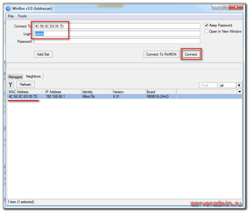Нажимаем на мак адрес устройства, он должен будет скопироваться в поле Connect To. Пароль по-умолчанию для входа в роутеры mikrotik — пустой, а пользователь — admin. Вводим имя пользователя, поле с паролем оставляем не заполненным. Нажимаем connect. Нас встречает информационное окно, в котором приведено описание стандартных настроек.