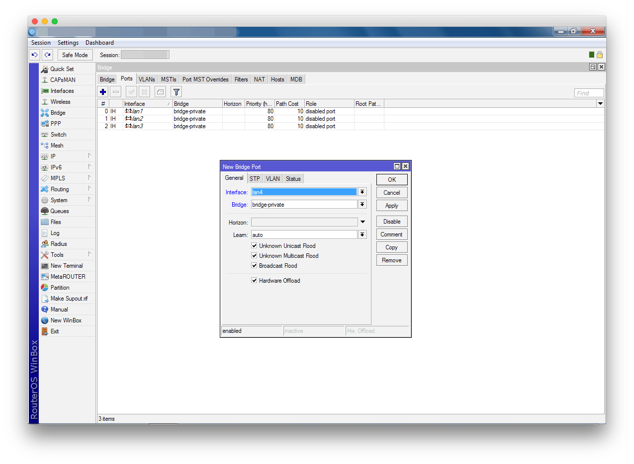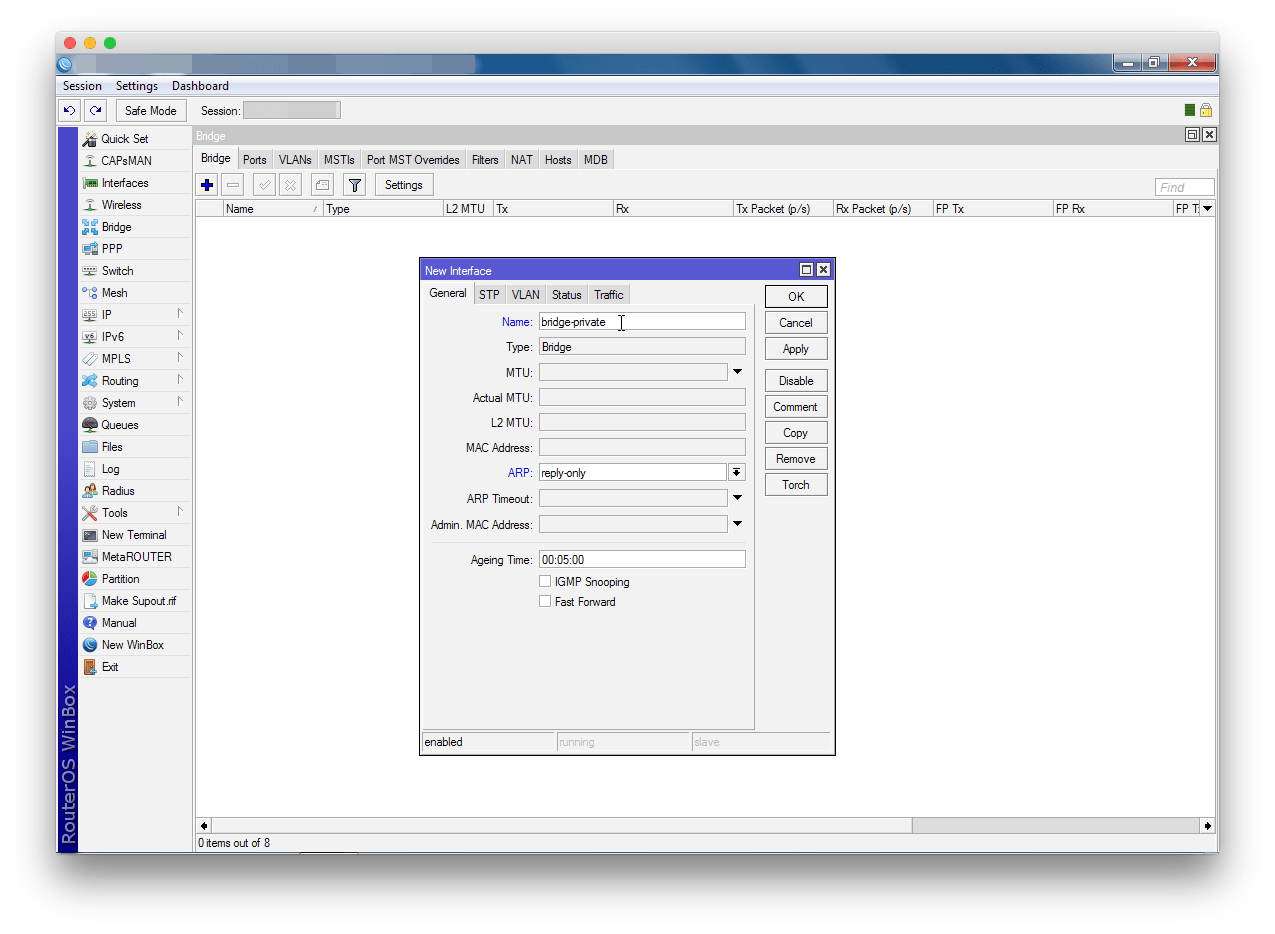 откройте окно создания нового моста. В качестве имени используйте bridge-private , установите значение reply-only в поле ARP