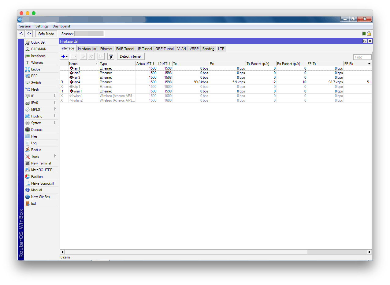 содержит список всех интерфейсов устройства. У модели hAP AC их восемь: один SFP