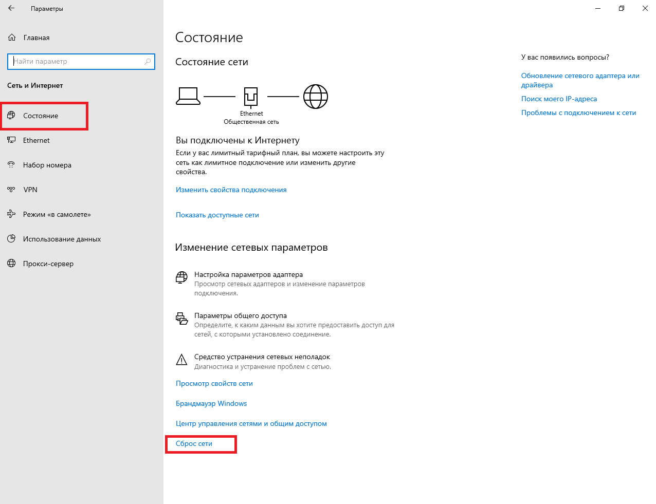 Windows 10: сброс параметров сети через интерфейс системы.