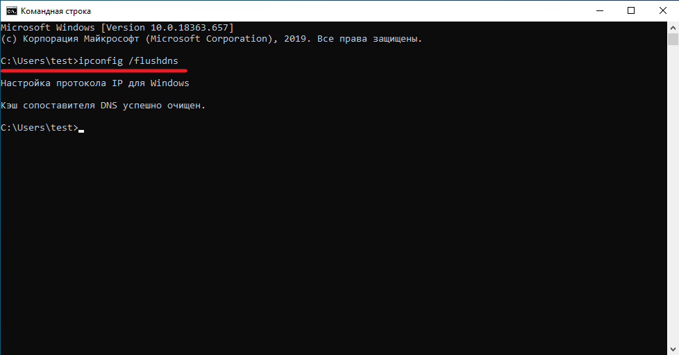 Как и предыдущих этапах потребуется открыть командную строку “ cmd ” и ввести команду: ipconfig /flushdns