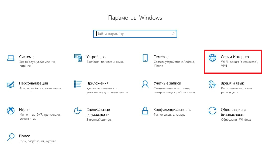 Зайдите в меню настроек.Его можно найти как через меню «Пуск«, так и обратившись к сочетанию «горячих» клавиш: Win + I (одновременно нажатие).Перейдите к разделу «Сеть и интернет«.