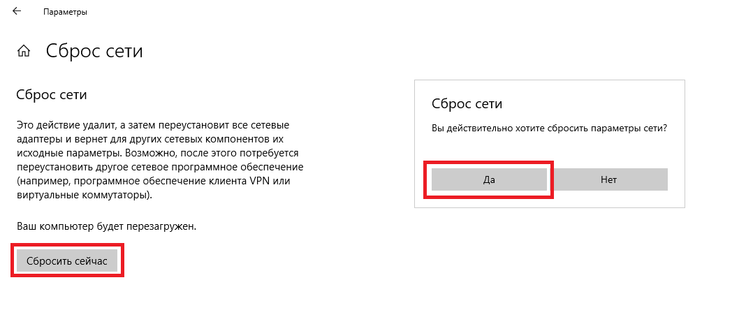 После нажатия кнопки потребуется подтвердить сброс сетевых настроек и подождать некоторое время, пока компьютер перезагрузится.