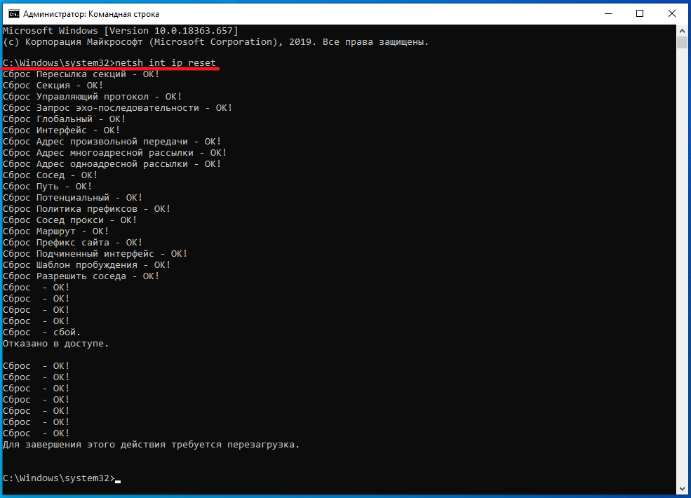 Введите команду “ n etsh int ip reset ”, и, как команда завершит свою работу, перезагрузите пк и проверьте доступ в сеть.