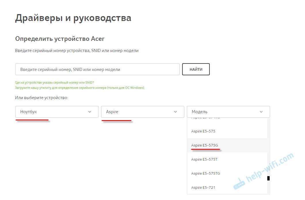 - В поле поиска ввести модель своего ноутбука Acer, серийный номер, или SNID. Эту информацию можно посмотреть снизу ноутбука, на наклейке.