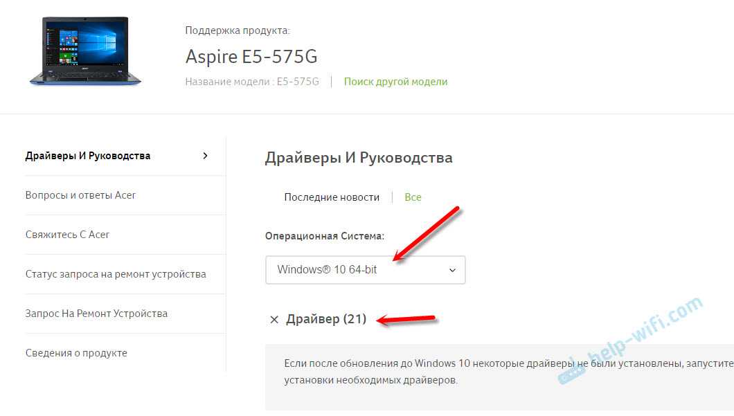 Сразу откроется страница с загрузками для вашей модели ноутбука Acer. Там будут драйвера, программы, руководства. Сначала выберите свою операционную системы. В моем случае, драйвера только для Windows 10 64-bit. Если вы установили другую версию Windows, для которой нет драйверов на официальном сайте, то придется помучатся с поиском. Или устанавливать ту систему, для которой есть драйвера на сайте производителя.