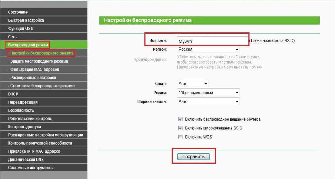 - В поле «Имя сети (SSID)» указать любое название, тем самым изменив имя беспроводного подключения.