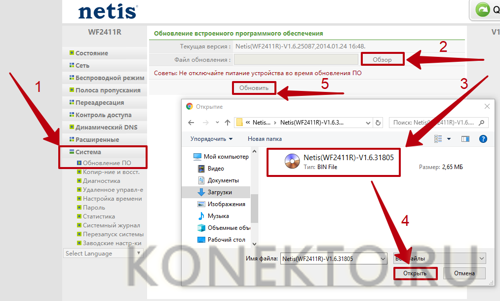 Войти в настройки роутера (выше показано, как это сделать). Открыть раздел «Система» — вкладка «Обновление ПО» («System», «Firmware Upgrade»). Нажать на кнопку «Обзор» и выбрать на ноутбуке распакованный файл прошивки в формате BIN. Кликнуть «Обновить».