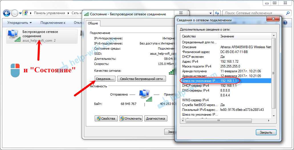 В новом окне нажмите на кнопку «Сведения. «. Откроется еще одно окно, в которой посмотрите адрес в строке «Шлюз по умолчанию IP. «. Это и будет адрес вашего роутера в локальной сети.