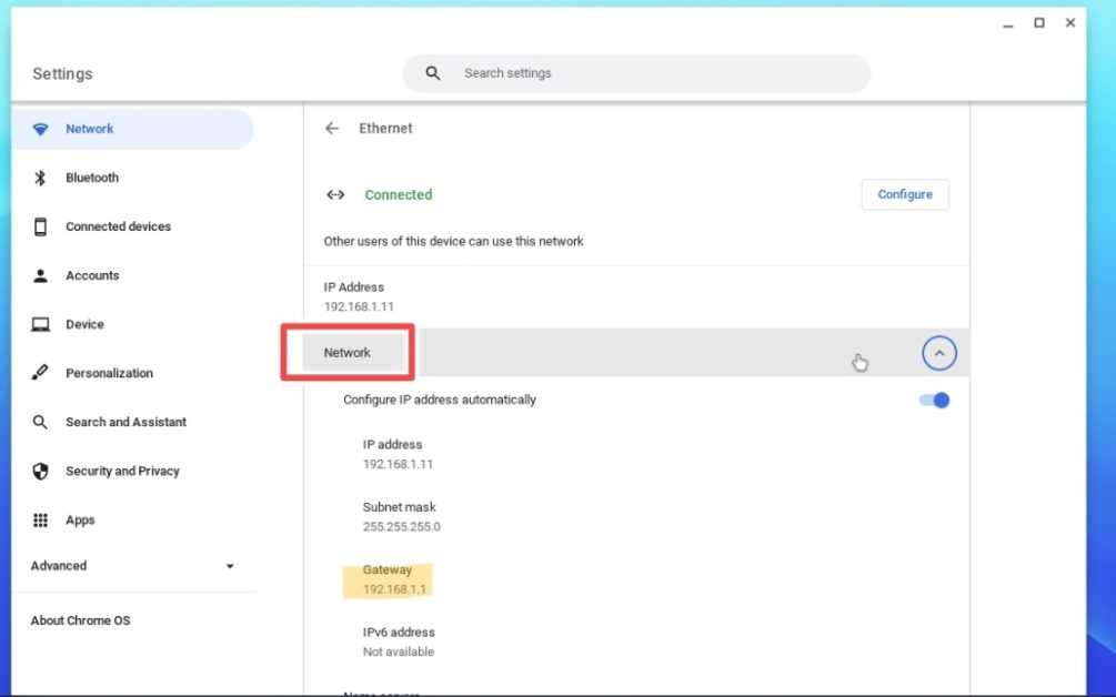 Наконец, вы попадаете в основные настройки. Нажмите «Сеть», и IP-адрес маршрутизатора будет указан в разделе «Шлюз».