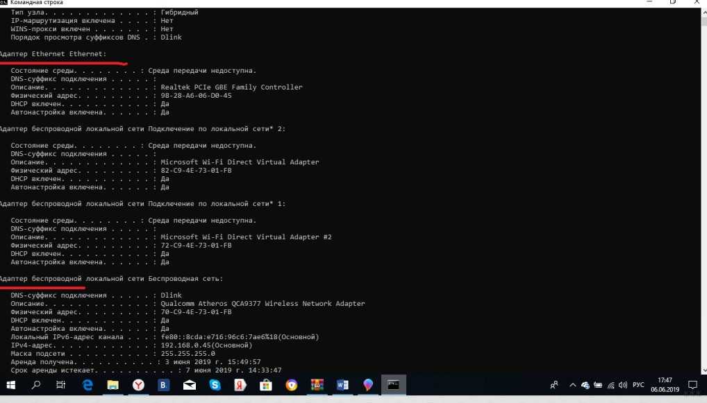 Как только команда будет выполнена, на мониторе появится информация о сетевых платах, установленных на компьютере.