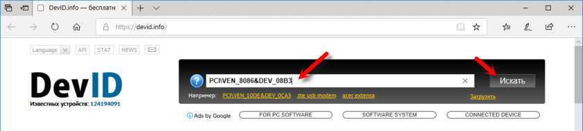Для такого способа определения нужно зайти на компьютерный сайт devid.info или подобный. На нем в окно поиска нужно вставить код устройства и получить все его характеристики. Также есть возможность сразу скачать драйверы. Чтобы получить код, нужно: