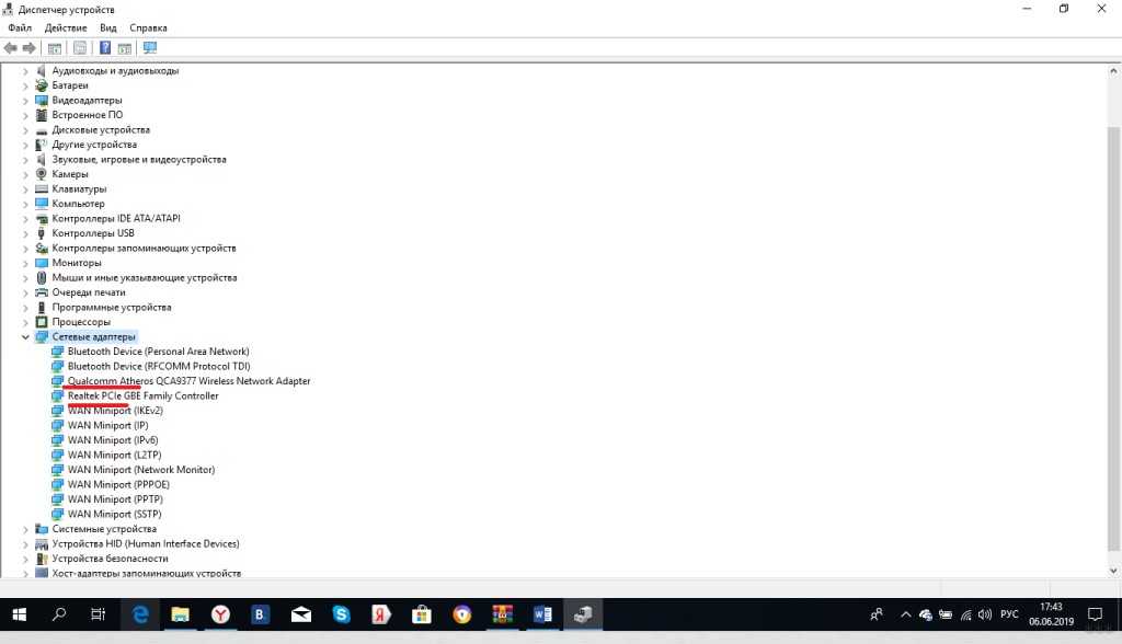 У меня видно, что есть Ethernet карта Realtek – в нее подключается кабель провайдера или патч-корд, если доступ к интернету организуется через роутер. Есть еще беспроводной адаптер Qualcomm – для подключения к Wi-Fi сети.