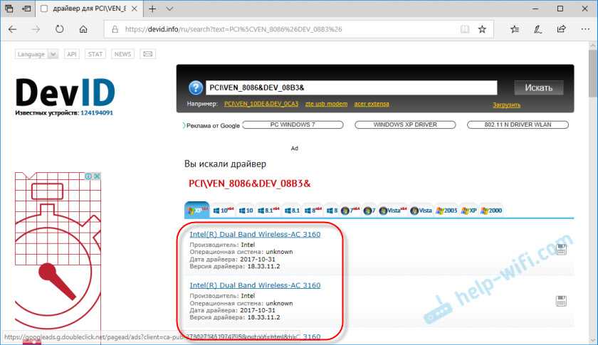 Видим, что сайт определил наш Wi-Fi модуль. Это Intel(R) Dual Band Wireless-AC 3160.