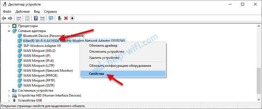 Откройте диспетчер устройств. Можно нажать сочетание клавиш Win+R, ввести команду devmgmt.msc и нажать Ok. Откройте вкладку «Сетевые адаптеры», найдите там Wi-Fi адаптер (в названии обычно есть «Wi-Fi», «Wireless», «802.11», «Dual-Band») нажмите на него правой кнопкой мыши и выберите «Свойства».