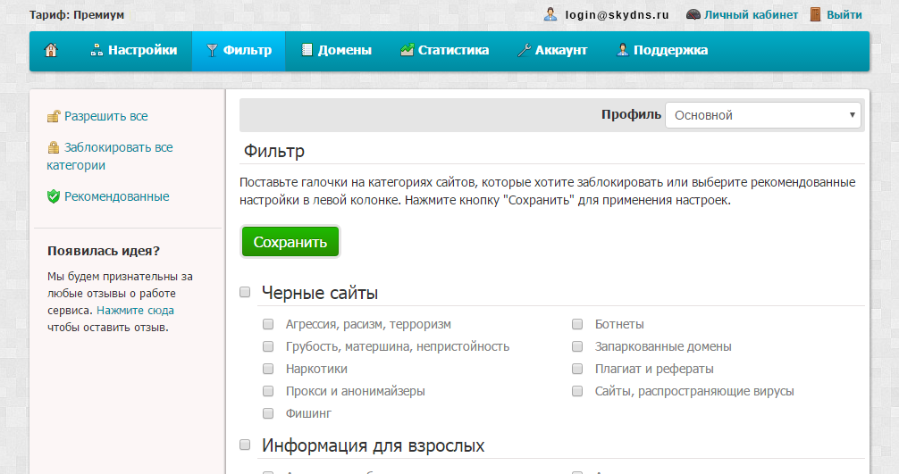 На вкладке «Фильтр» можно настроить разрешенные или запрещенные категории сайтов (распределение по категориям осуществляется как в автоматическом режиме, так и вручную сотрудниками SkyDNS, базы постоянно обновляются).