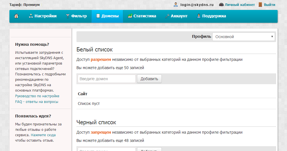 В «Личном кабинете» нас интересуют вкладки «Фильтр» и «Домены», в которых настраиваются профили контентной фильтрации.