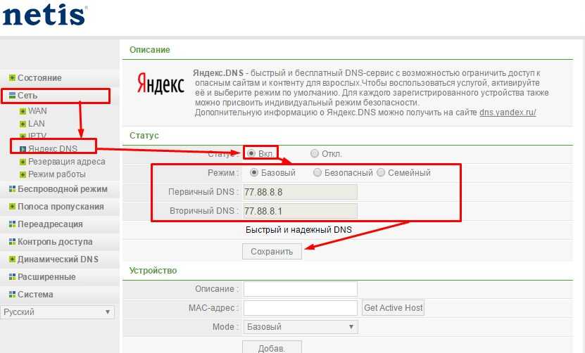 Переходим в «Сеть» – «Яндекс.DNS» и включаем режим. Вписывать ДНС адреса не нужно, достаточно просто выбрать режим.