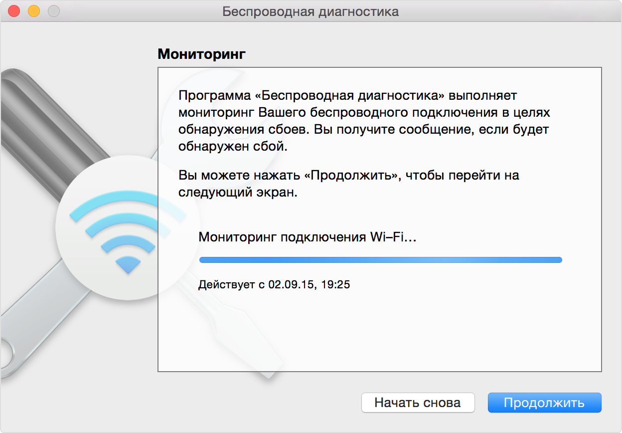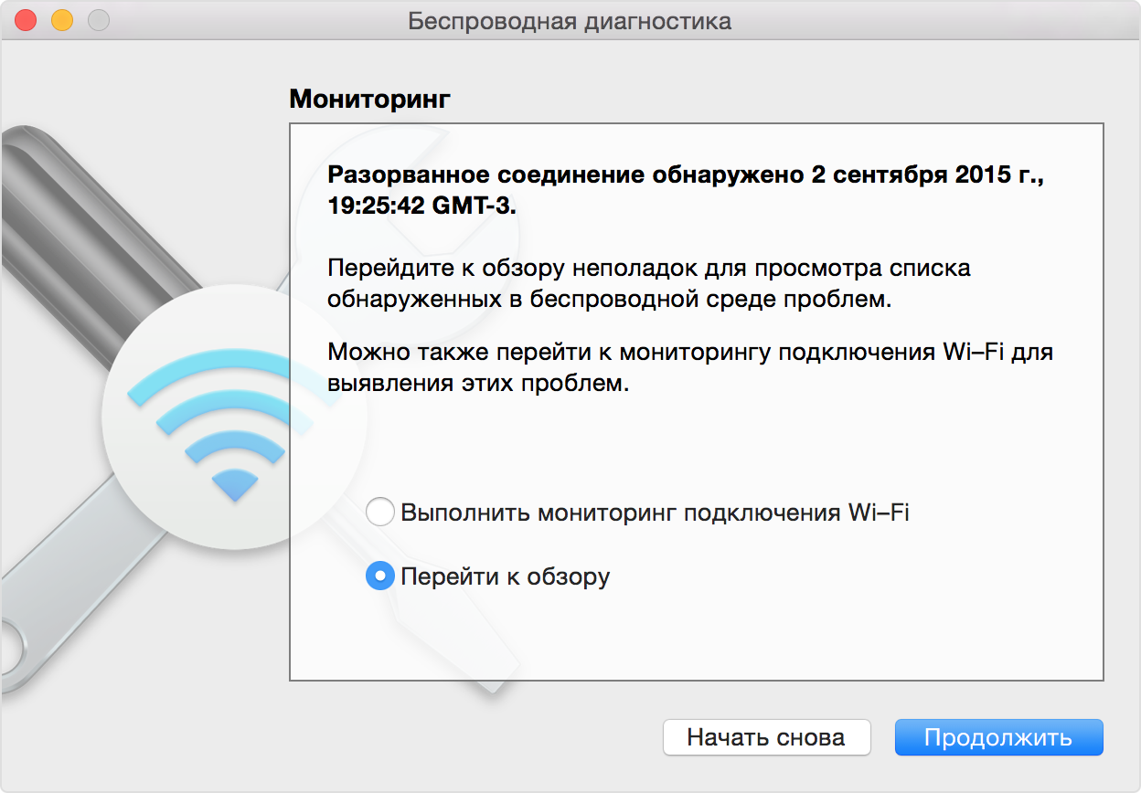 Если программа «Беспроводная диагностика» обнаружит проблему, мониторинг будет остановлен и вы увидите краткое описание проблемы. После этого можно будет возобновить мониторинг или перейти к окну обзора для просмотра подробных сведений и рекомендаций.