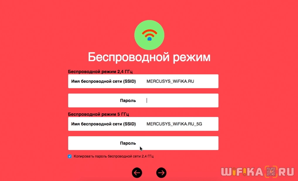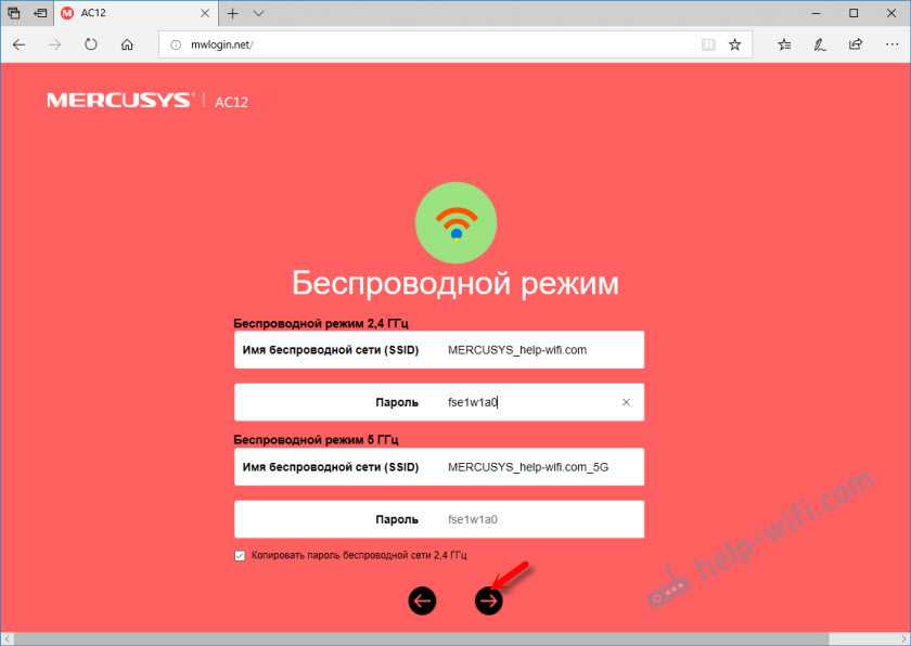 На следующем шаге мастер попросит настроить параметры беспроводных сетей. Роутер Mercusys AC12 умеет работать сразу в двух диапазонах частот WiFi, поэтому здесь мы имеем возможность задать отдельные имена и пароли для каждой из них. Или же поставить флажок на идентичные ключи авторизации для обеих сетей.