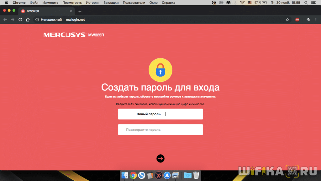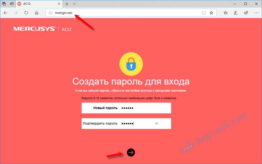 Дальше на подключенном к роутеру устройстве запускаем любой браузер и переходим по адресу http://mwlogin.net. Роутер попросит нас два раза указать новый пароль администратора (который будет защищать настройки роутера). Придумываем пароль, указываем его в соответствующие поля и продолжаем.Если страница с настройками не открывается, то смотрите эту статью: как зайти в настройки роутера Mercusys на mwlogin.net.