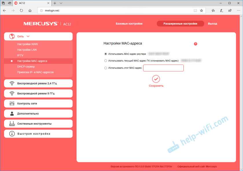 Настройки MAC-адреса. Этот раздел понадобится вам в том случае, когда провайдер делает привязку по MAC-адресу. Можно клонировать MAC-адрес с компьютера (к которому подключены по кабелю), или прописать адрес вручную. Там же можно посмотреть MAC-адрес вашего Mercusys AC12, чтобы при необходимости прописать его у провайдера.