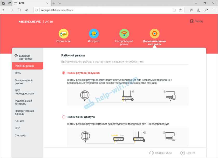 В дополнительных настройках можно сменить режим работы роутера, настроить подключение к интернету или задать настройки LAN, установить параметры родительского контроля, или сменить системные настройки роутера (обновление прошивки, отключение LED-индикаторов, смена пароля роутера и т. д.).