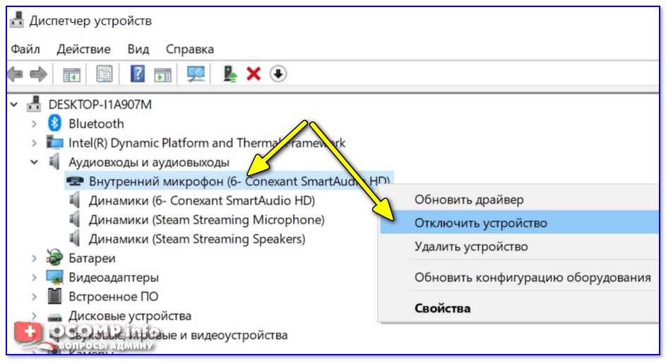 В ней должно быть устройство «Внутренний микрофон» (у ноутбуков). Нажав на него правой кнопкой мыши, вы сможете легко отключить его. Пример ниже.