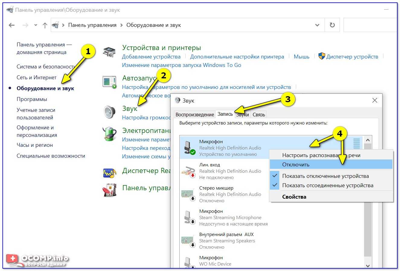 Далее нужно открыть раздел «Оборудование и звук / звук» и перейти во вкладку «Запись» : в ней будут представлены все микрофоны, подключенные к компьютеру. Каждое из них можно быстро откл./вкл. (достаточно нажать на него ПКМ).