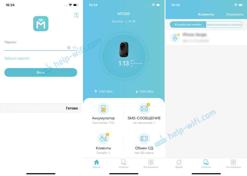 Launch the tpMiFi app. If the router is found, you will need to enter the administrator password of the router. Let me remind you that the factory password is (if you have not changed it) — admin On the main page we we immediately see information about the operator, the network in which the router operates, the signal level and the data used. Below is battery information, SMS section, connected clients and SD swap (this model does not support SD cards).Also on the bottom panel there is a Clients tab, where you can view the list of connected devices, set for each (by clicking on it) a data usage limit (megabytes), set a limit on incoming and outgoing speed.»