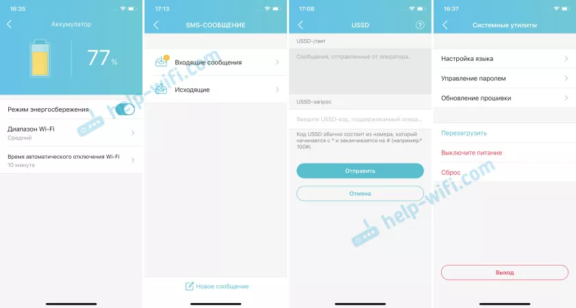 Next we have a section with battery settings (you can see the charge level, enable power saving mode, change the Wi-Fi range and set the Wi-Fi network to turn off when the router is not in use). There is also a separate page where you can view/send SMS messages and USSD commands. For example, to check the status of an account, bonuses, change tariff plans.