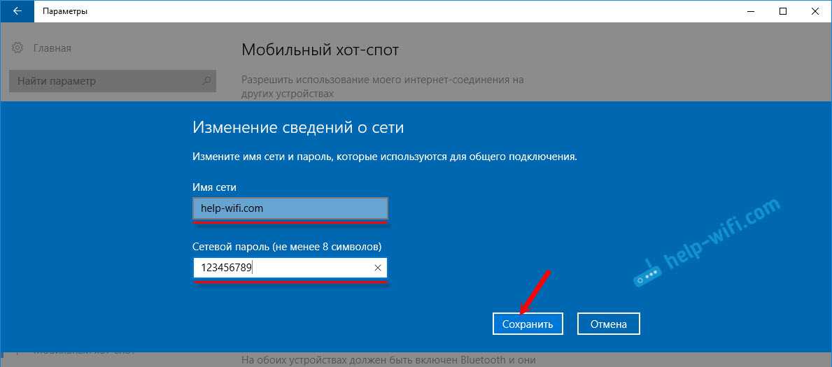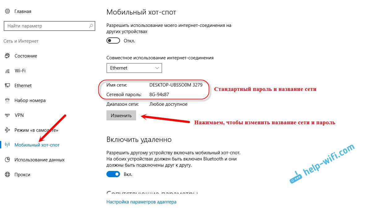 Открываем раздел «Мобильный хот-спот». Там сразу будет задано стандартное название Wi-Fi сети, которую будет транслировать компьютер и так же задан стандартный пароль, который нужно использовать для подключения к этой сети. Вы можете их оставить, а можете изменить. Для этого нажмите на кнопку «Изменить».