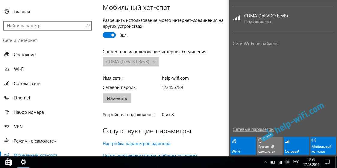 Вот и все, компьютер раздает интернет по Wi-Fi. Можете подключать к мобильной сети свои устройства, используя установленный пароль. Одновременно можно подключить максимум 8 устройств. Информация по клиентам мобильной точки доступа будет отображаться в этом же окне.