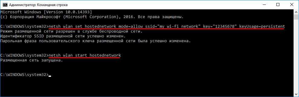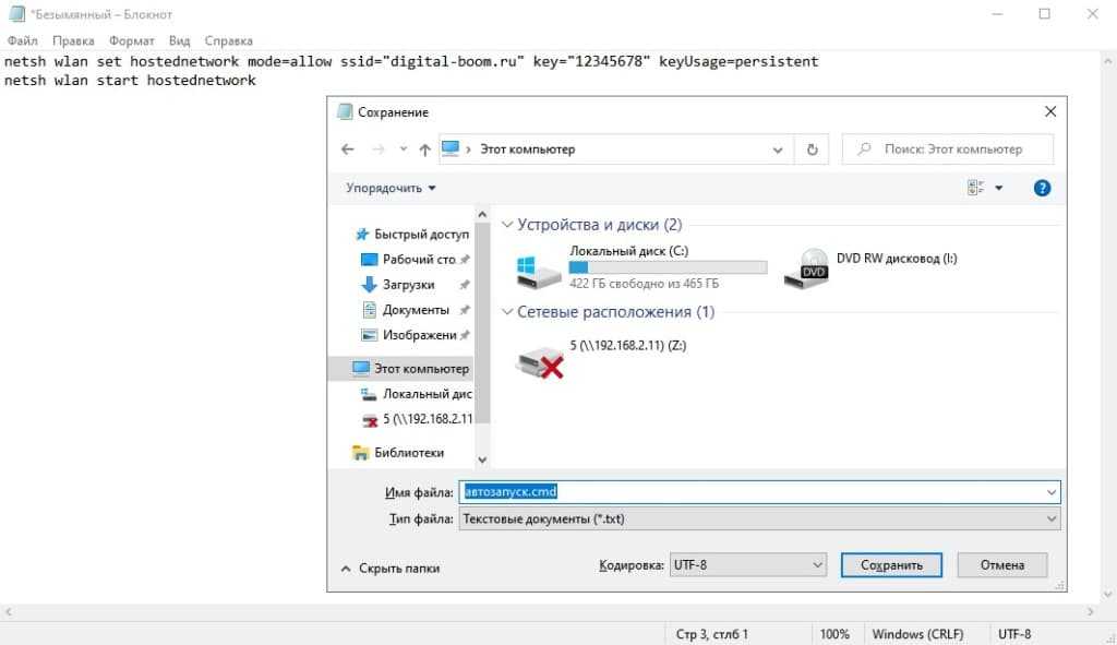 netsh wlan set hostednetwork mode=allow ssid="digital-boom.ru" key="12345678" keyUsage=persistent netsh wlan start hostednetwork