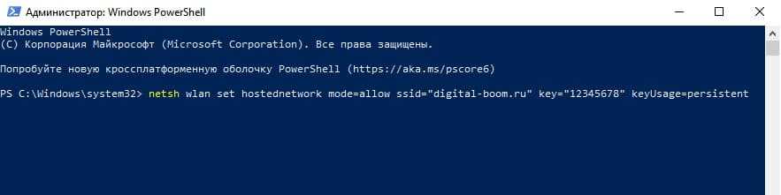 netsh wlan set hostednetwork mode=allow ssid="digital-boom.ru" key="12345678" keyUsage=persistent