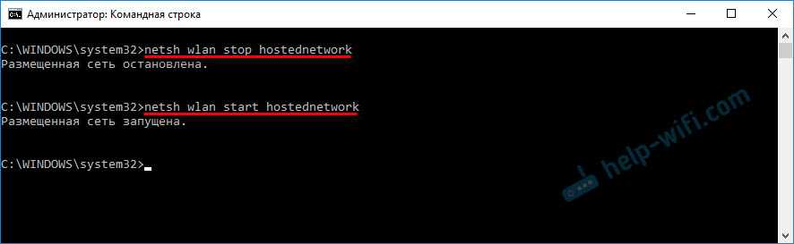 - Затем нужно написать следующую строку: netsh wlan start hostednetwork. После чего опять нажать Enter.