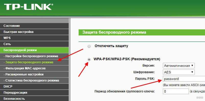 - В разделе «Защита беспроводного режима» выбираете «WPA2 Personal». Прописываете пароль, указанный на коробке, или придумываете индивидуальный. Он должен состоять как минимум из 8 символов (латинские буквы и цифры).